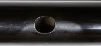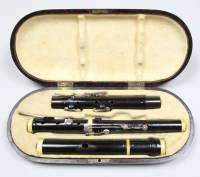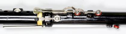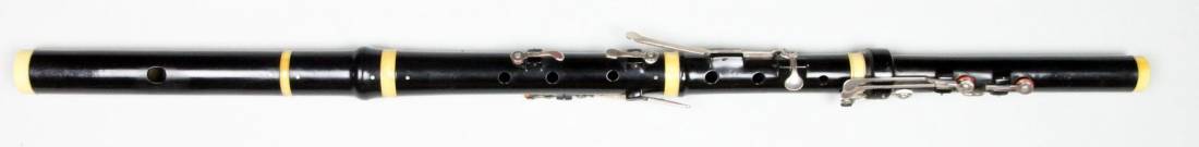 Konstruktion: Ebenholz, lackiert. 4teilig. H-Fuss. Bohrung konisch. Garnituren aus Elfenbein. Klappen aus Silber; tief H für Daumen rH; C2 für lH 2; B und F je mit Zusatzhebel; Hebel für C-Klappe führt über Cis-Klappe. Alle Klappen mit Zinnpolstern; alle Tonlöcher metallgefüttert. Bocklagerung, mit Metallführungen. Kopfstück mit eingelegtem Metallrohr. Stimmzug, graduiert. Korkspindel und Indexstift (graduiert) aus Elfenbein.